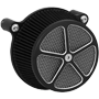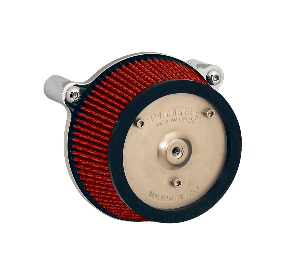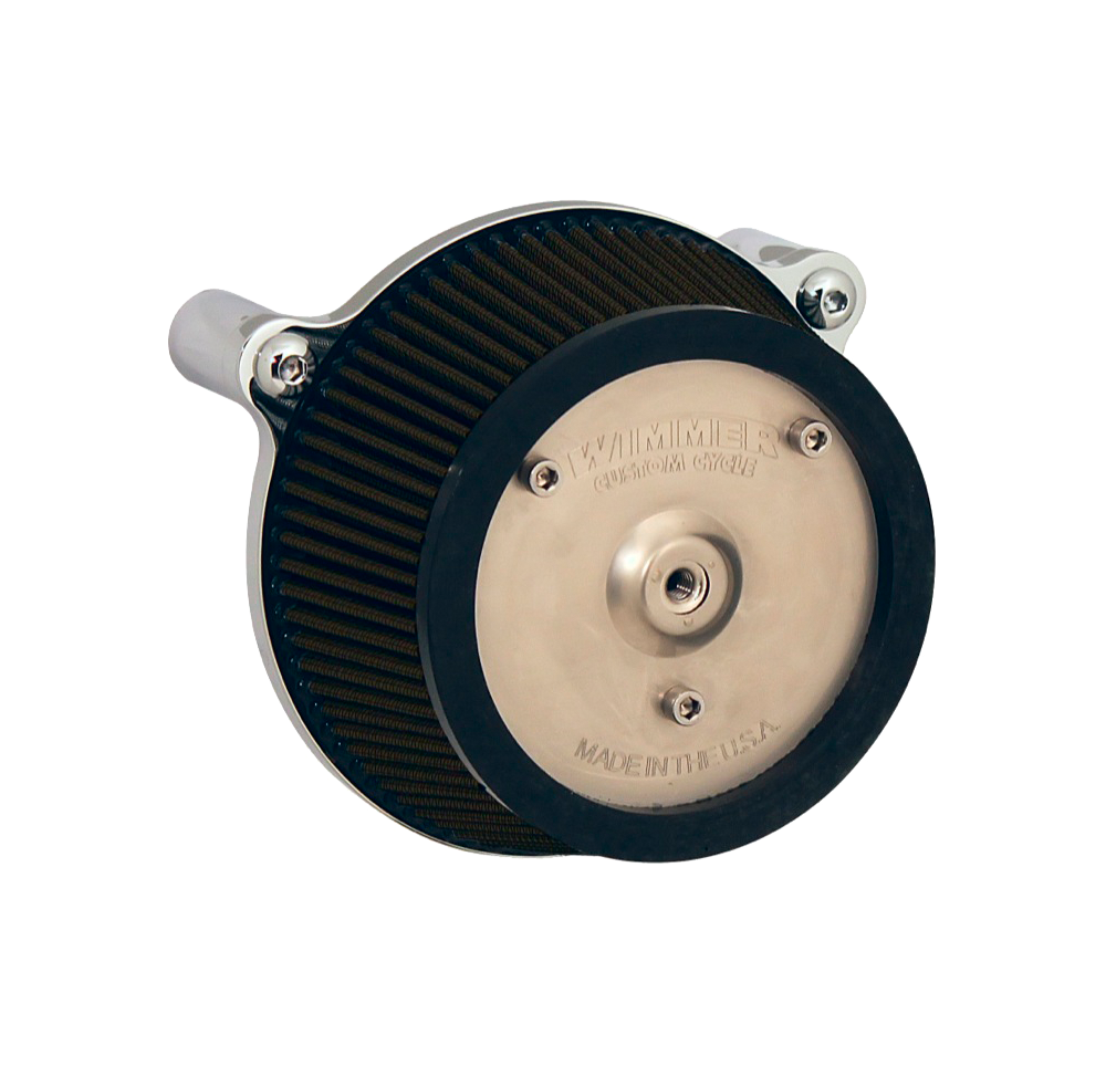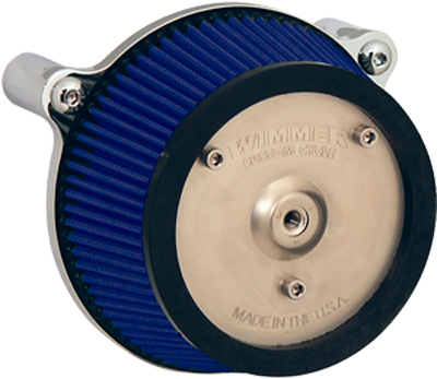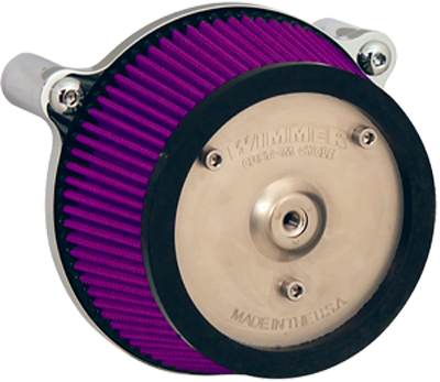 Performance and affordability are what make this a top selling air cleaner. Features include a billet aluminum back plate which provides better strength – eliminating broken, cast back plates that plague similar setups. Machined into each back plate sits a recessed pocket that encapsulates the performance air filter base, minimizing the unsightly look of the air filter base. The performance filter measures 2.75” deep, providing ample clean air to the oversized radius inlet. Head breathing is provided thru an internal passage in the back plate – providing a clean and practical solution. Better Sucker kits are available in black powder coat or chrome finish, five filter colors, will accept the factory Twin Cam "oval style" air cleaner cover, Wimmer Custom Cycle’s exclusive AirStar covers, or similar aftermarket covers that use a 5.5 inch diameter and center mounting screw. Covers sold separately.