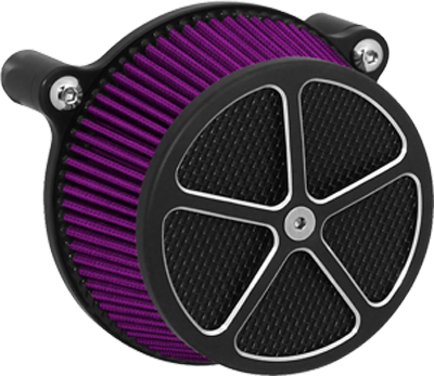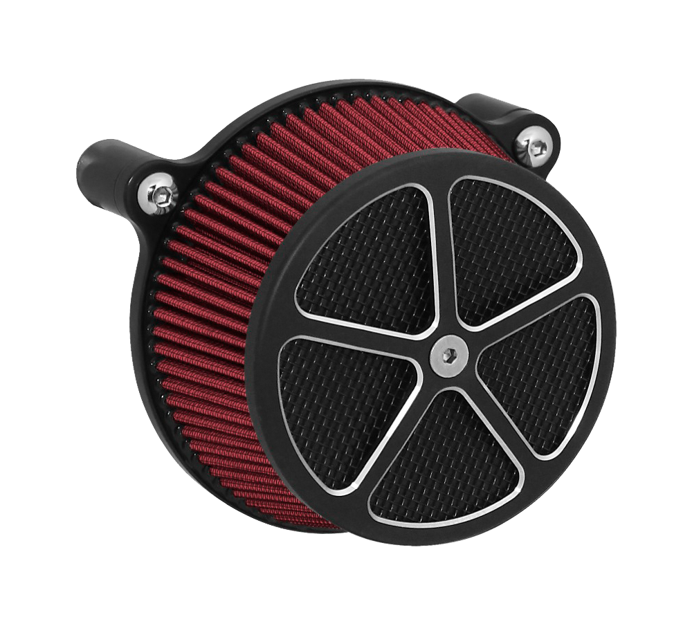 Performance and affordability are what make this a top selling air cleaner. Features include a billet aluminum back plate which provides better strength – eliminating broken, cast back plates that plague similar setups. Machined into each back plate sits a recessed pocket that encapsulates the performance air filter base, minimizing the unsightly look of the air filter base. The performance filter measures 2.75” deep, providing ample clean air to the oversized radius inlet. Head breathing is provided thru an internal passage in the back plate – providing a clean and practical solution. At the front of the air cleaner is the exclusive Wimmer Custom Cycle Air Star cover. Finely crafted and machined from a solid block of billet aluminum is your choice of a 3 or 5 spoke pattern. Beneath the billet cover lays the dutch woven stainless steel screen and plastic insert. Better Sucker with Air Star Cover kits are available in black powder coat, re-machined black, or show chrome. Five filter colors, stainless steel dutch woven screen, or black powder coat screen finish off the options.